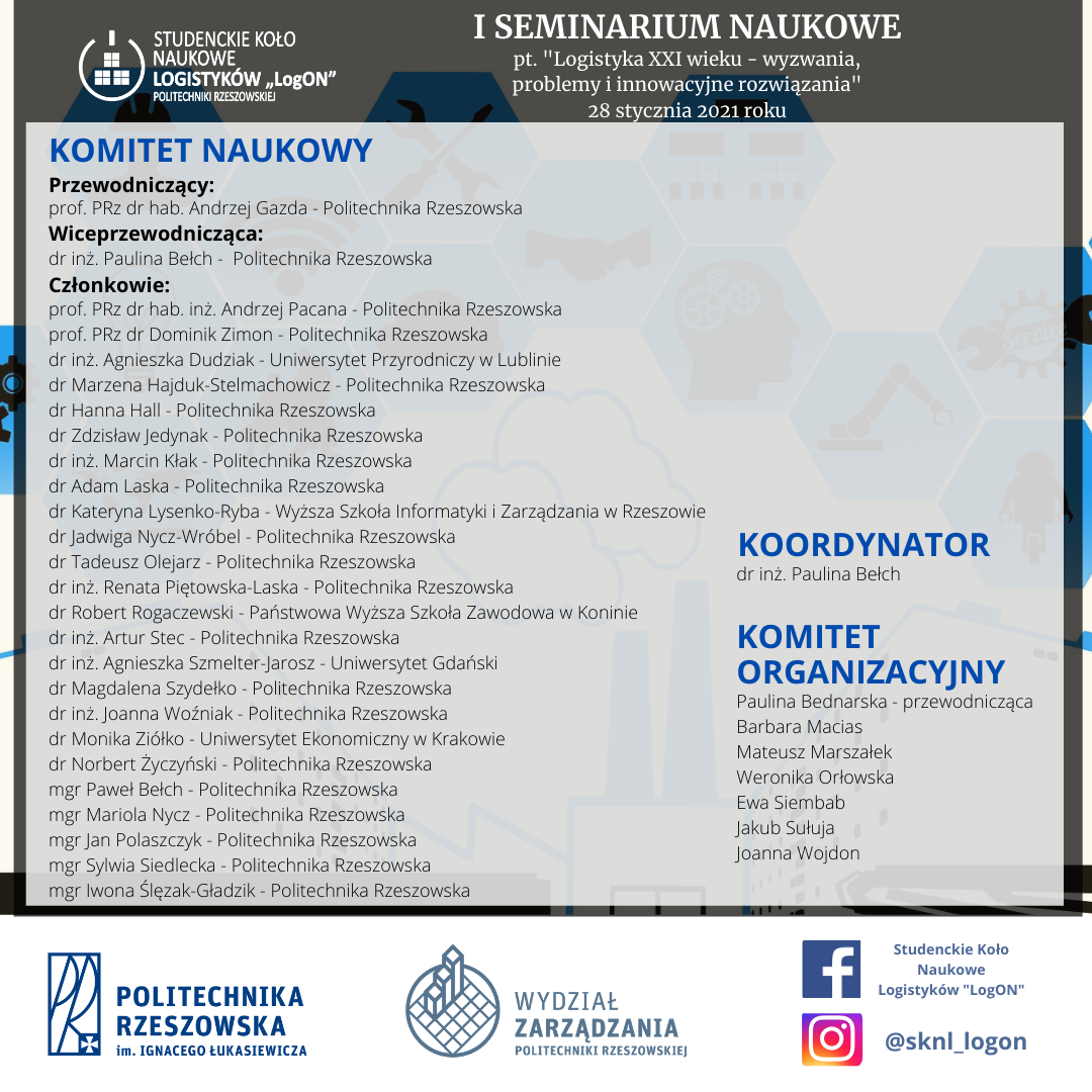 W dniu 28 stycznia 2021 roku odbyło się I Ogólnopolskie Seminarium Naukowe pt. "Logistyka XXI wieku - wyzwania i innowacyjne rozwiązania" zorganizowane przez Studenckie Koło Naukowe Logistyków “LogON” oraz Katedrę Systemów Zarządzania i Logistyki Wydziału Zarządzania Politechniki Rzeszowskiej.