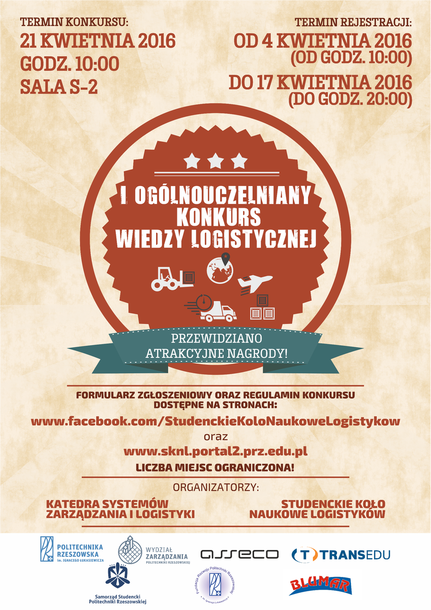 W dniu 21 kwietnia 2016 r. odbył się I Ogólnouczelniany Konkurs Wiedzy Logistycznej, organizowany przez Katedrę Systemów Zarządzania i Logistyki oraz Studenckie Koło Naukowe Logistyków (SKNL).