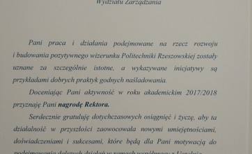 Nagroda Rektora Politechniki Rzeszowskiej dla Pani Prezes SKNL