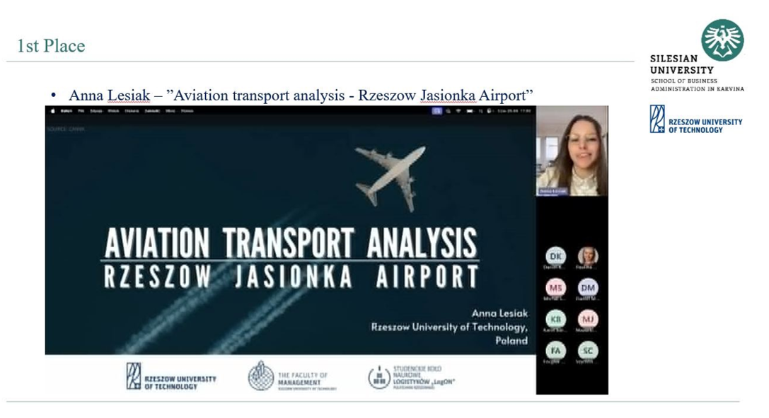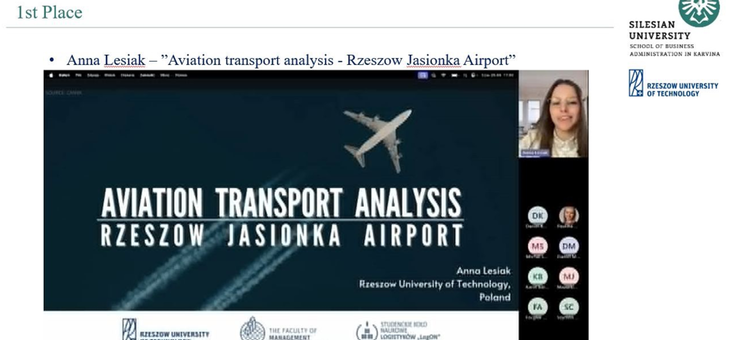 Podczas konferencji odbył się również konkurs na najlepsze wystąpienie publiczne. Laureatką konkursu została Pani Anna Lesiak, prezes Studenckiego Koła Naukowego Logistyków „LogON”, która zajęła pierwsze miejsce za referat pt. „Aviation Transport Analysis – Rzeszów Jasionka Airport”.