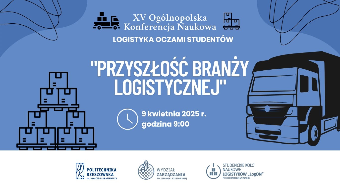 Zakład Systemów Zarządzania i Logistyki na Wydziale Zarządzania Politechniki Rzeszowskiej oraz Studenckie Koło Naukowe Logistyków “LogON” serdecznie zapraszają do udziału w XV Ogólnopolskiej Konferencji Naukowej z cyklu „Logistyka oczami studentów” pt. “Przyszłość branży logistycznej”, która odbędzie się 9 kwietnia 2025 roku o godzinie 9.00 w formie hybrydowej, zarówno w budynku Arcus Politechniki Rzeszowskiej w sali 302 jak i za pośrednictwem platformy Microsoft Teams. Zgodnie z regulaminem wydarzenia studenci PRz występują stacjonarnie.