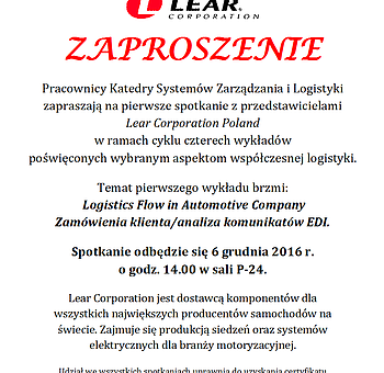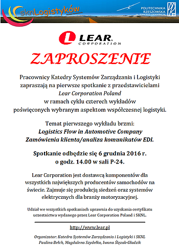 Pracownicy Katedry Systemów Zarządzania i Logistyki zapraszają na pierwsze spotkanie z przedstawicielami Lear Corporation Poland w ramach cyklu czterech wykładów poświęconych wybranym aspektom współczesnej logistyki.