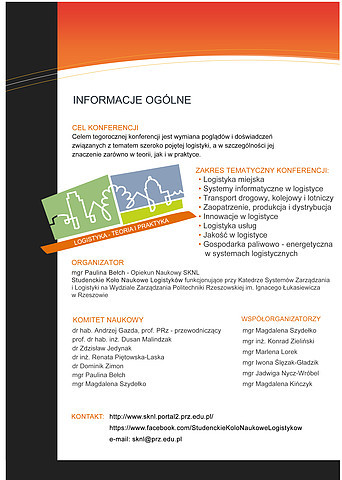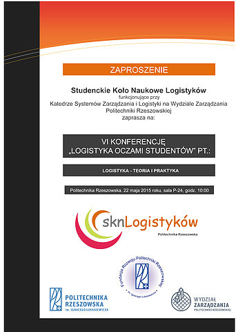 Studenckie Koło Naukowe Logistyków Wydziału Zarządzania Politechniki Rzeszowskiej zaprasza na VI Konferencję Logistyczną „Logistyka oczami studentów” pt.: Logistyka - teoria i praktyka w dniu 22 maja 2015 roku, godz. 9:00, sala P-24.
