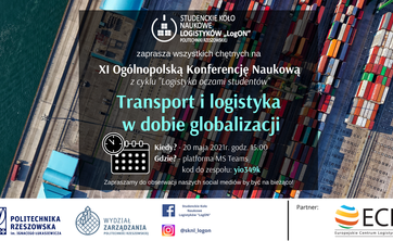 20 maja 2021 roku odbyła się XI Ogólnopolska Konferencja Naukowa z cyklu „Logistyka oczami studentów” pod tytułem Transport i logistyka w dobie globalizacji.