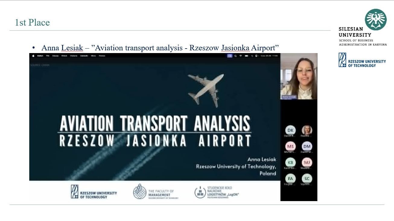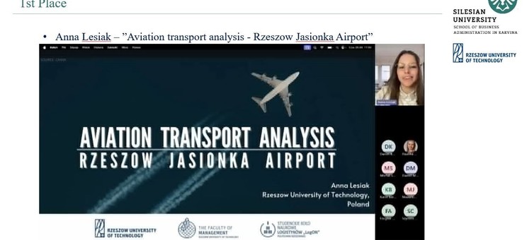 Podczas konferencji odbył się również konkurs na najlepsze wystąpienie publiczne. Laureatką konkursu została Pani Anna Lesiak, prezes Studenckiego Koła Naukowego Logistyków „LogON”, która zajęła pierwsze miejsce za referat pt. „Aviation Transport Analysis – Rzeszów Jasionka Airport”.